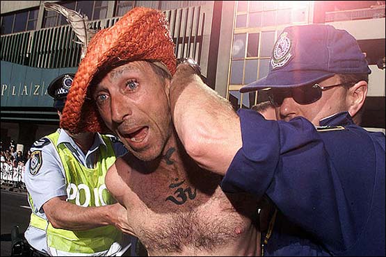 * یک اکتبر 2000: وی از حفاظ پرید و در حالیکه یک ساز بادی استرالیایی به دست داشت، در برگزاری رقابتهای دوی ماراتن المپیک 2000 سیدنی اختلال ایجاد کرد.