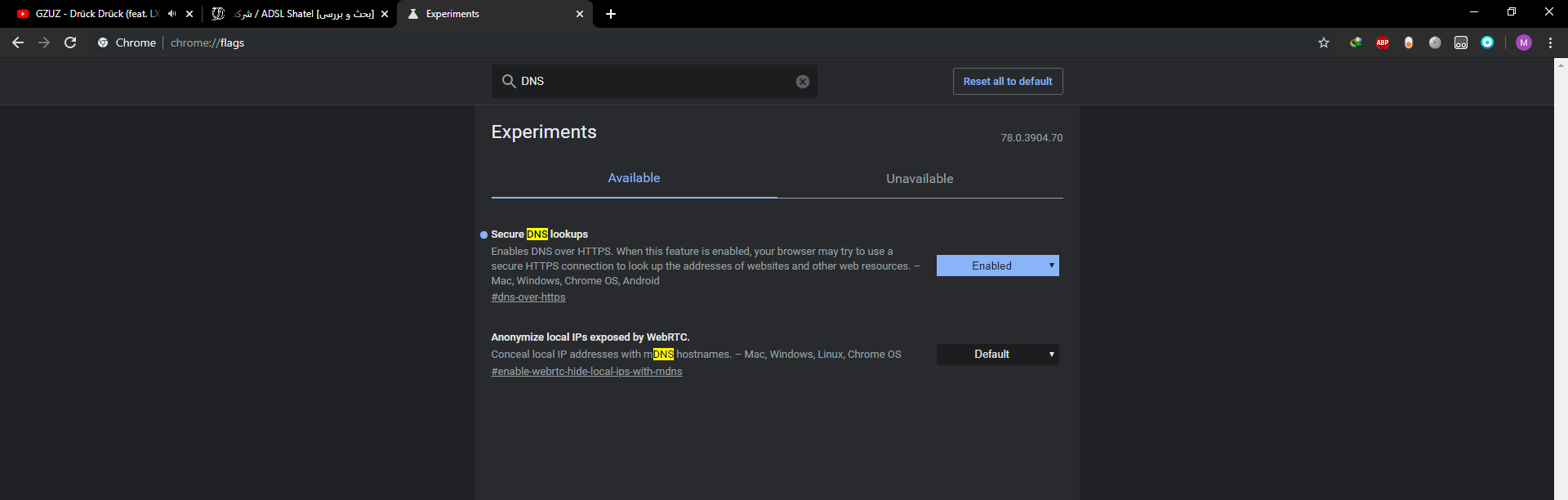 اینتر رو بزنید و وارد شوید سپس در جستجو dns رو سرچ کنید و اولین اپشن Secure Dns Lookup از default به enabled تغیر بدید