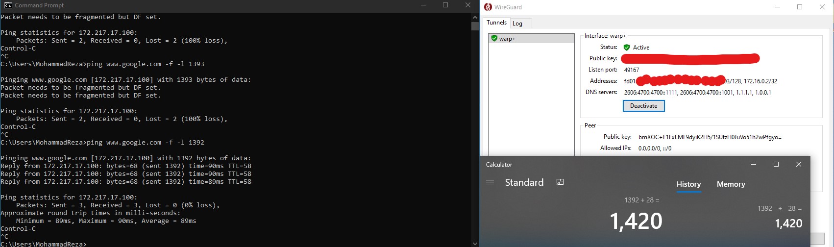 البته حدس هایی میزنم، ممکنه وایرگارد به دلیل حفظ امنیت، اجازه شکسته شدن و به دو نیم تقسیم شدن بسته های خودش رو نمیده، وقتی بسته هایی با MTU بزرگ بسازه و به مودم برسه، مودم برای اینکه بخواد اونها رو ارسال کنه، باید به مقدار تعریف شده اونها را کوچک و به دو (یا چند) بسته تقسیم کنه، اینجاست که بخاطر عدم اجازه تقسیم به مقدار های کوچک تر داده دارپ میشه و از بین میره، ارتباط برقرار نمیشه.