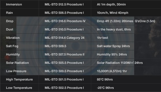 As you can notice from the picture, the phone is not your plain vanilla Android device – it is designed to meet military spec MIL-STD-810G toughness standards. In plain language, this means that the phone is capable of taking just about any kind of physical abuse without losing even a tad of its functionality. In case you don’t believe me, check out the tested toughness criteria, which the device meets below: