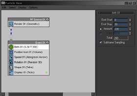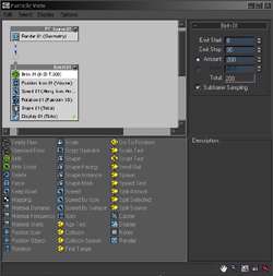 هر عملگر(operator) شامل مجموعه ای از پارامترهاست که می توانید آنها را در بستر زمان تغییر داد. تا رفتار ذره ها را متحرک سازی نمایند. برای دستیابی به تغییرات پیچیده در خصوصیات و رفتار ذره ها می توانید یک جریانFlow ایجاد نمایید. جریان قادر است ذره ها از یک رویداد به رویداد دیگر ارسال نماید. (بر اساس آزمونها). به عنوان مثال یک آزمون مشخص می کند که این ذره از عمر خاصی گذر نمود و یا با چه سرعتی در حال حرکت است و آیا با یک مانع برخورد نموده است. ذره هایی که از آزمون گذر می کنند به رویداد بعدی ارسال می شوند و آنهایی که از آزمون گذر نمی کنند در همان رویداد اولیه باقی می مانند. آزمون ها و عملگرها را در مجموع عملیات(Actions) می نامند.