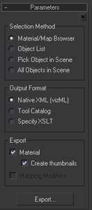 به کمک آن می توانید یک ماده ایجاد شده را به یک فایلXML ارسال نمایید. فایلهایXML را می توان با دیگر کاربران3DS MAX به اشتراک قرار داد. آنها می توانند این گونه فایلها را در داخل پنجرهWindows Explorer پیدا کرده و کلیک نموده و کشیده و بر روی شی داخل صحنه رها کنند. یا از طریق برنامه کمکیAsset Browser به داخل نرم افزار آورده و بر روی ماده داخل پنجرهMaterial Editor رها نموده. برای خروجی گرفتن از این نوع فایل ها به منوی