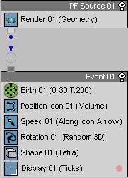 به طور پیش فرض در پنجرهParticle View شش رخداد وجود دارد که این رخدادها به رویداد سراسریPF Sourceمتصل هستند. عملگرPF Source یک عملگر سراسری می باشد که بر تمام رخدادها و عملگرها تأثیر دارد.