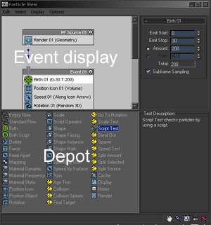 برای تغییر حالات این سیستم ذره ای به پانلModify می رویم این سیستم ذره ای بسیار قدرتمند از پنجره ای به نامParticle Viewسود می برد. برای دسترسی به این پنجره به منویGraph Editorمی رویم و گزینهParticle Viewرا می زنیم و یا با فشار دادن کلید6از روی کی برد به این پنجره دسترسی پیدا می کنیم. تمام تنظیمات اصلی این سیستم در این پنجره قرار دارد. به طور کلی این پنجره به چهار قسمت اصلی تقسیم می شود. قسمت بزرگ بالا سمت چپ راEvent displayمی نامند. چون رویدادها در این قسمت دیده و مشاهده می شود و قسمت مدیریت رویدادها است.
