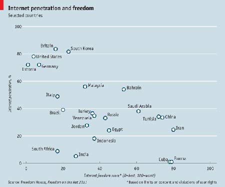 در اين گزارش عنوان شد كه دسترسي به شبكههاي اجتماعي در تشديد فعاليتهاي مخالفان در سراسر جهان عرب تاثير بسزايي داشته است. همچنين در برخي كشورها از جمله گرجستان و استوني آزاديهاي اينترنتي در حال حاضر بيشتر از دو سال گذشته است.