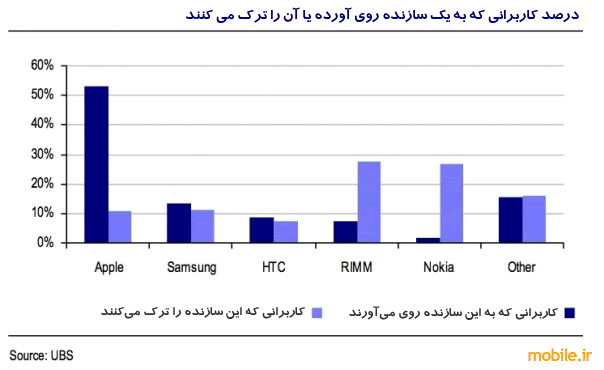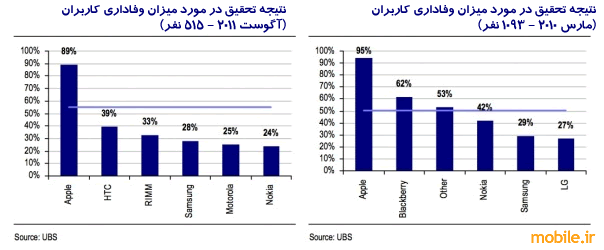 گزارشی که GigoaOM در تاریخ 22 سپتامبر 2011 (31 شهریور 1390) بر اساس بررسی های UBS Research منتشر نموده حاکی از آن است که کاربران آیفون وفادارترین کاربران نسبت به بستر موبایل کنونی خود هستند. نتایج این بررسی که با رأی گیری از 515 کاربر گوشی های هوشمند بدست آمده -- و البته به دلیل کوچک بودن جامعه نمونه آماری ممکن است از دقت بالایی برخوردار نباشد -- همخوانی نسبتاً بالایی با دیگر آمار منتشر شده در این زمینه دارد (به [Uگزارشی[/URL] که کمپانی Nielsen در سال گذشته منتشر نمود و گزارش شرکت Gfk مراجعه نمائید .)
